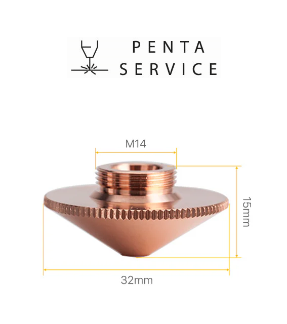 Сопло PENTA SERVICE высотой 15 мм, диаметром 32 мм, имеет диаметр отверстия 6,0 мм и резьбу М14, произведено из меди с соблюдением всех необходимых стандартов качества, технических и геометрических параметров изделий данного типа. В результате применения, сопло гарантирует сохранение расчётных параметров в течение длительного времени и обеспечивает высокую мощность работы оборудования лазерной резки.